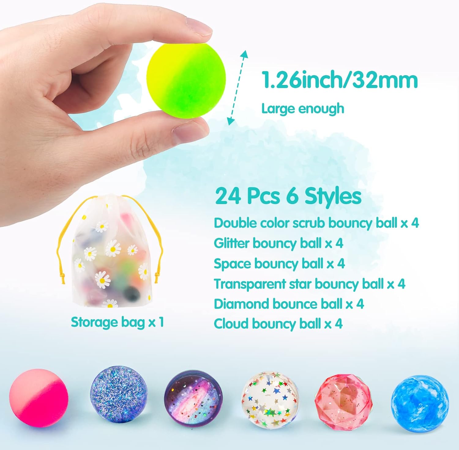 Assorted colors and styles: Bouncy balls come in a variety of multi-colors and 6 styles, glitter, diamand, stars, Double color scrub, Transparent star, Cloud . They are very useful for working hand-eye coordination, Perfect toys in bulk for goody bags, birthday party favors, bulk toys for prizes and carnival prizes.