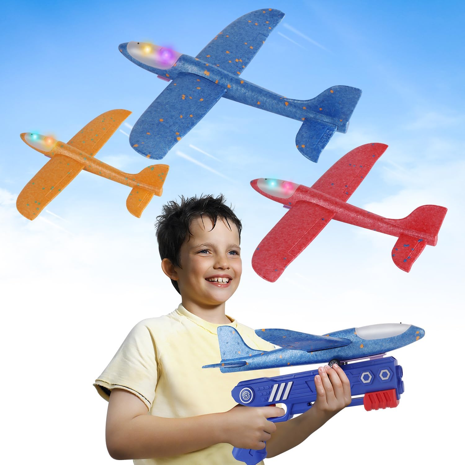 3 Pack Airplane Launcher Toys, 2 Flight Modes LED Foam Glider Catapult Plane Toys for Boys, Outdoor Toys for Boys Girls 3 4 5 6 7 8 9 10 11 12 Year Old … (3 Color)