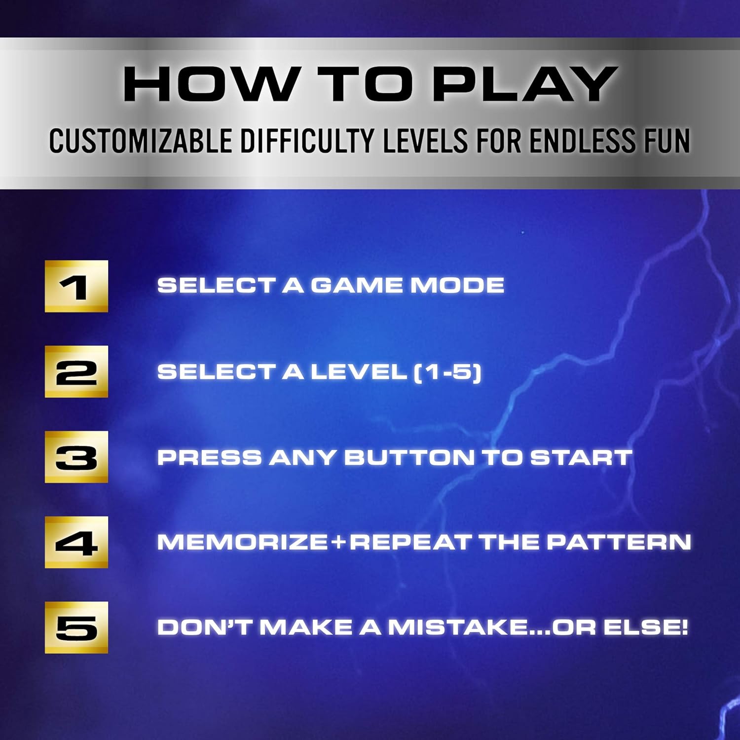 THREE LEVELS OF FUN: Try to match colors, colors & numbers, add in shapes for an extreme challenge.ELECTRIFYING FUN: This handheld electronic game takes the classic memory game to a whole new level with a shocking surprise when you don’t rise to the challenge.TEST YOUR SKILLS: Beat all 5 levels! Exercise those brain cells and grab some adrenaline with the charged up suspense and action of Reflex- the shocking game of memory.