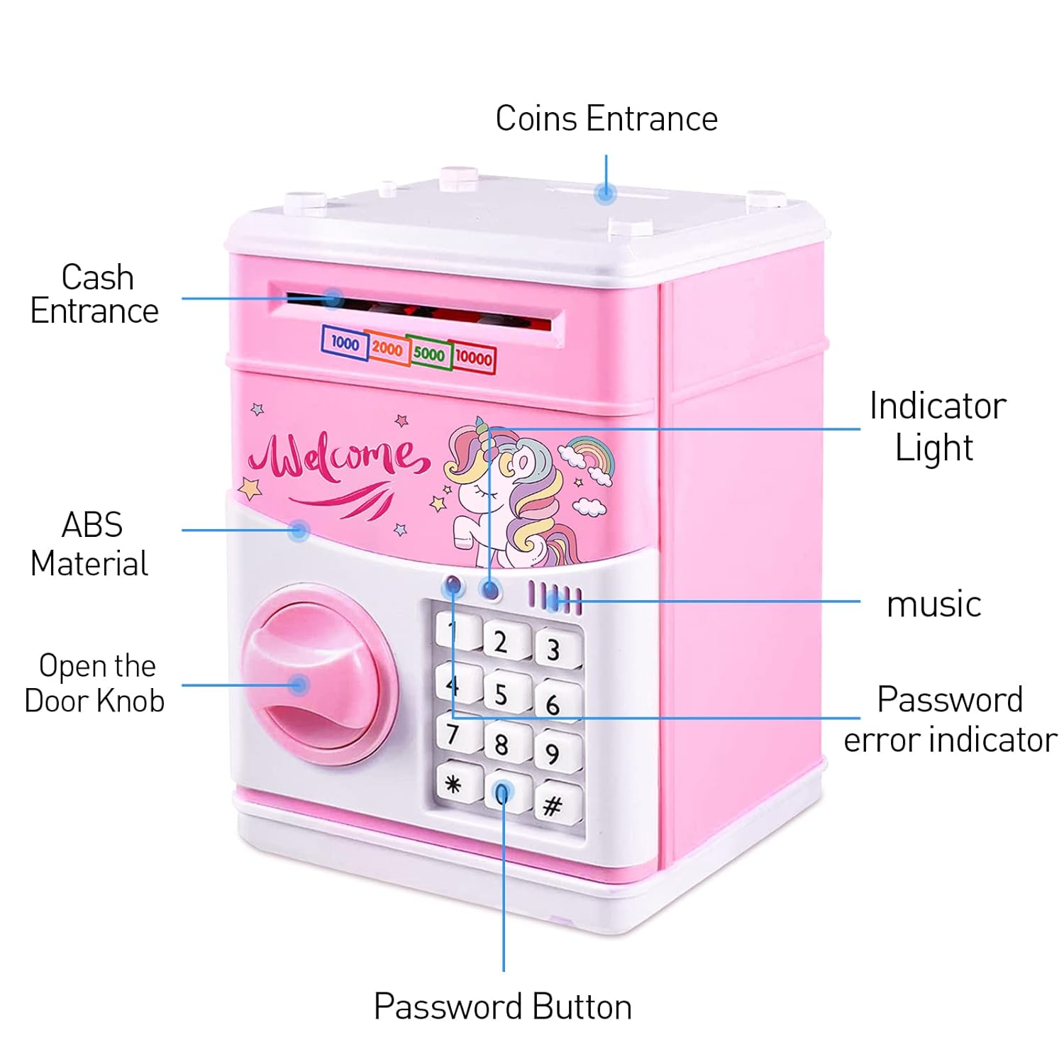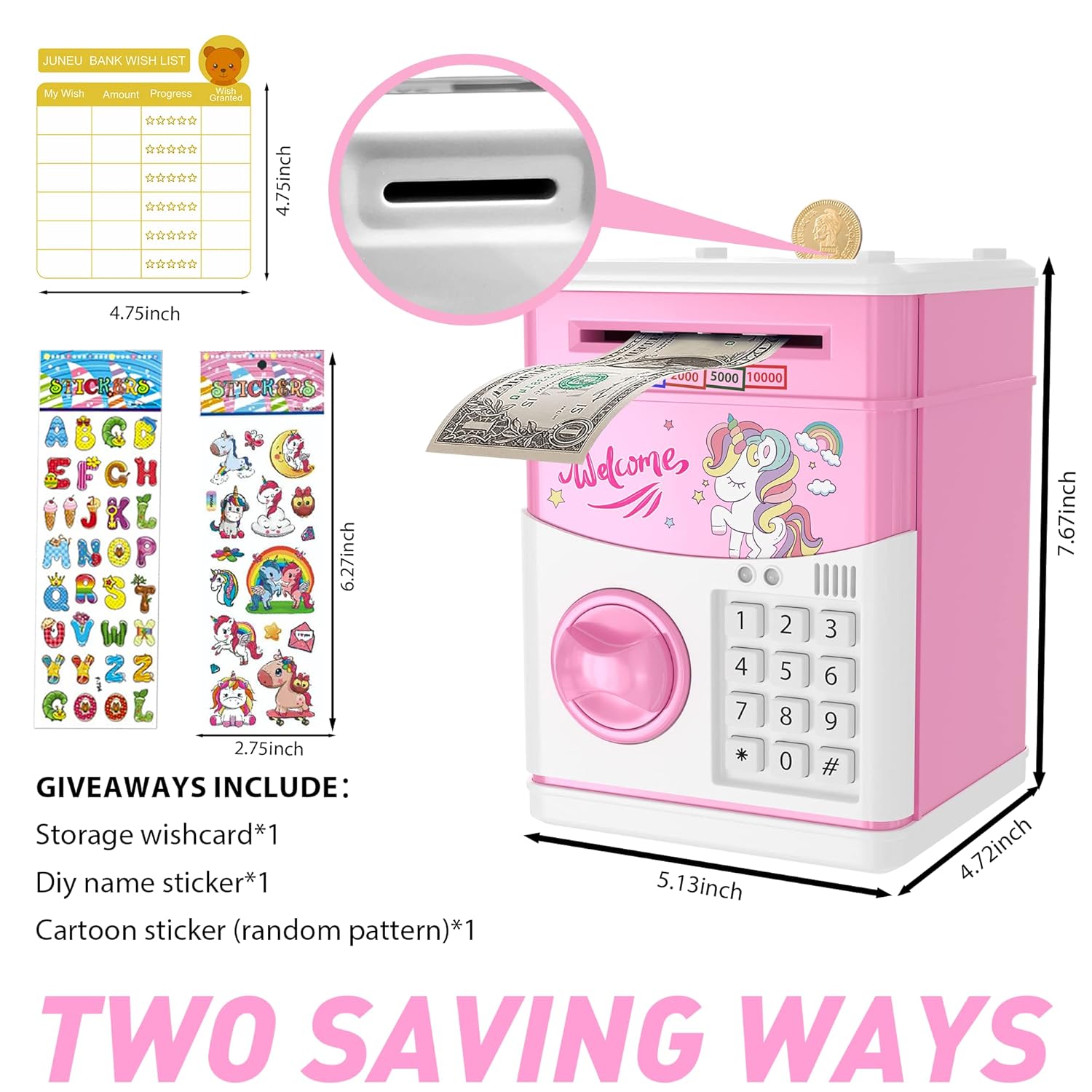 【Automatic Money Roll】- The paper money is put into the money box, the induction device is triggered and the cash money will be automatically involved. There is a coin slot on the top of the piggy bank to put coins to save money.
