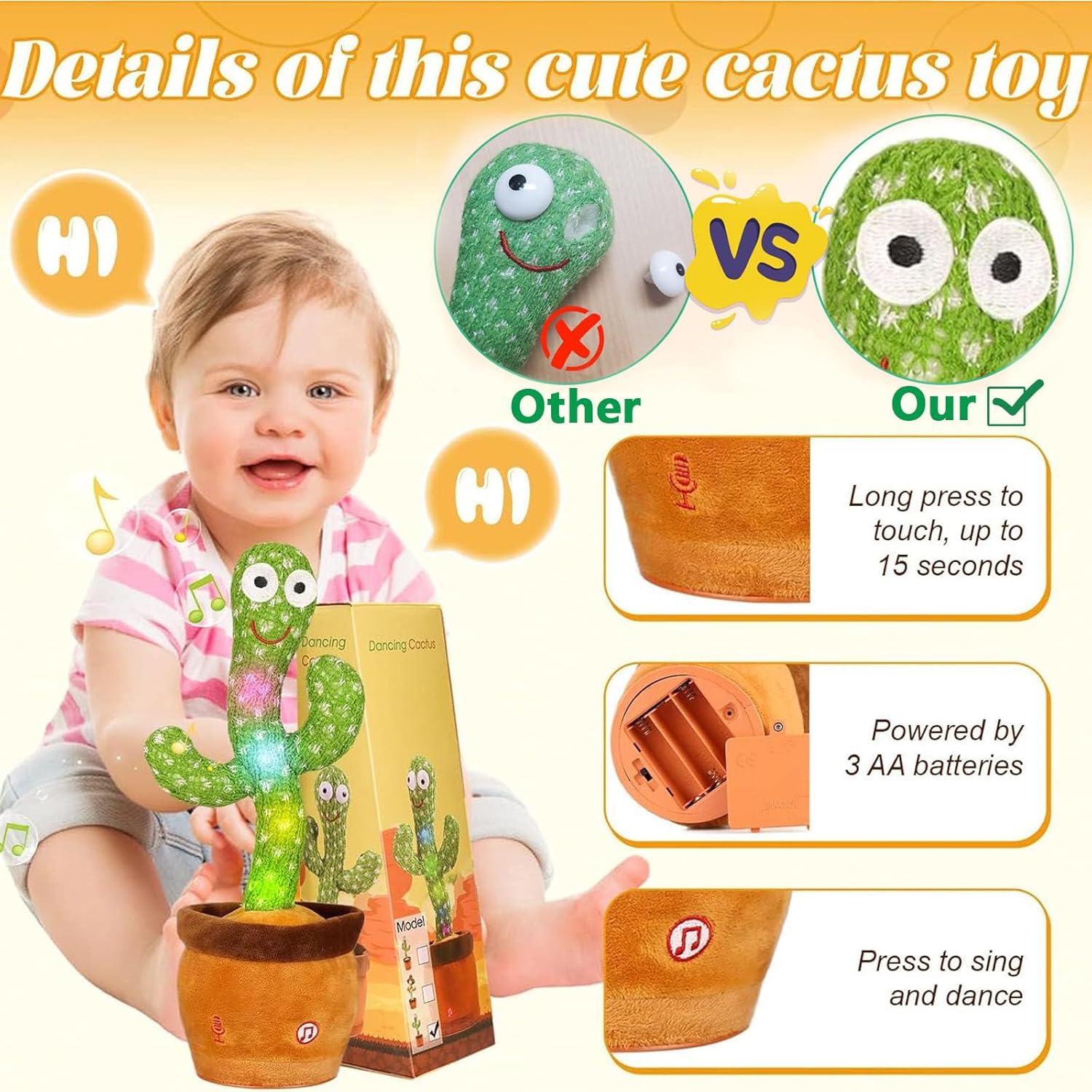 Eye Catching & Attractive: Our dancing cactus toy has attractive appearance which ensures to give attraction to your children. Talking cactus toy dances for a few hours which amuse your children. Cactus baby toy has Heavy Duty Knitted Fabric material, cute in shape, and furry in appearance.