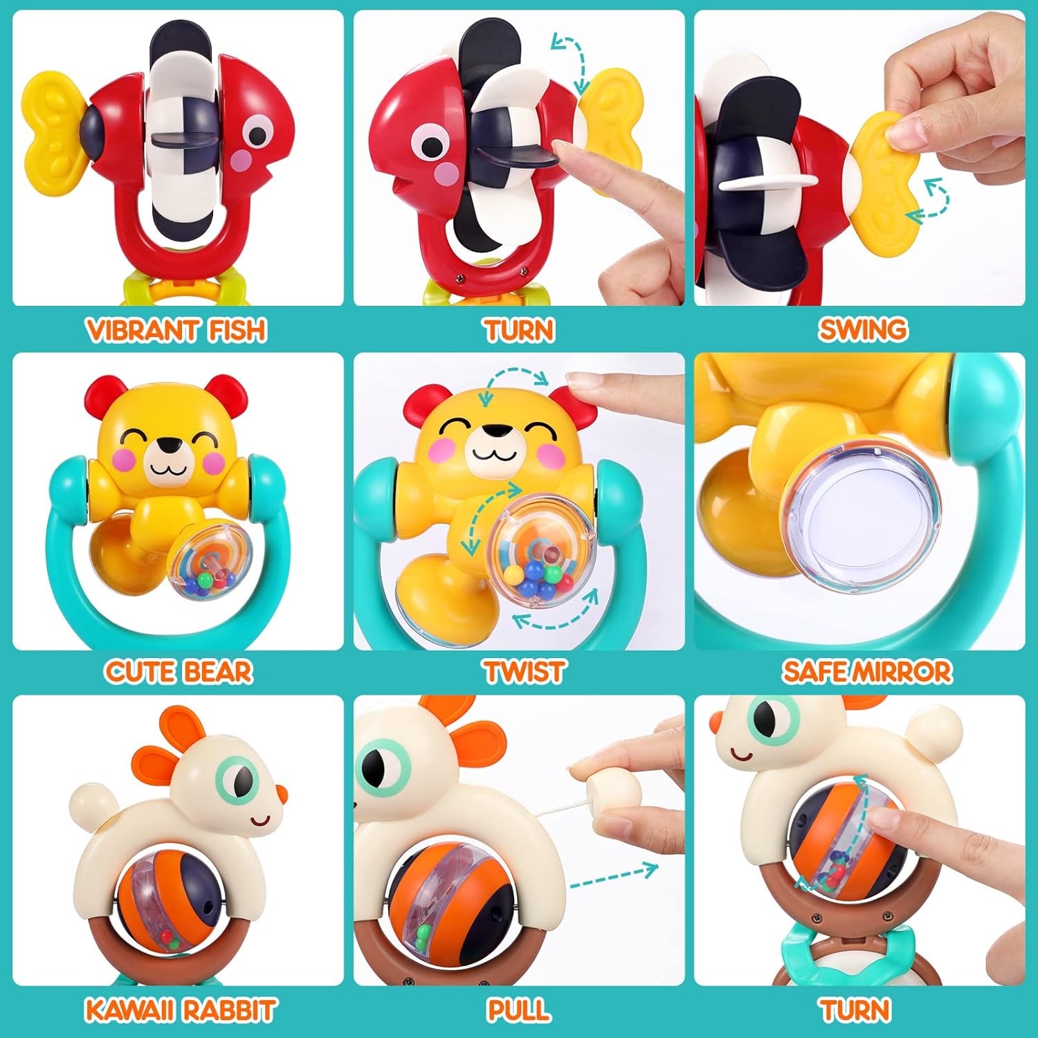 SAFE AND STURDY INFANT TOYS: Premium 6-12 months baby toys are made of non-toxic ABS, food-grade silicone teethers, 100% safe for baby to bite, effectively relieve your baby’s teething pain. Infant teething toys for baby 0-6 months, with smooth edges and no sharp burrs for safe grasping.Sensory toys for 1 2 year old, develop your kid’s sensory engagement well. An indispensable baby toys for 6 8 9 10 12 18 months!