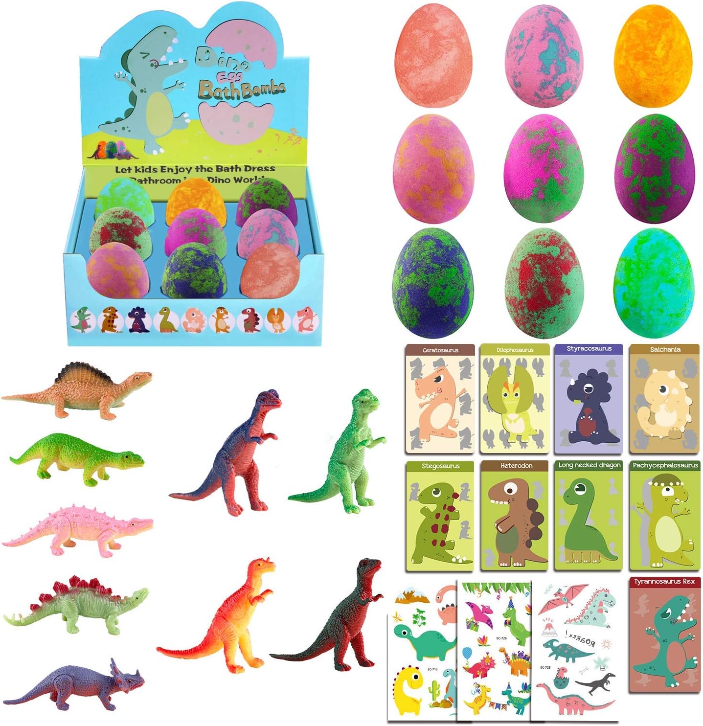 9 Colorful Dino Egg Bath Bombs Set: STARYAR kids bath bombs gift set can be used as stocking stuffers for kids, include 9 colorful dino egg bath fizzies with different dinosaur inside, extra-large bath bombs and dino toys, dinosaur toys for kids 3,4,5,6,7,8,9