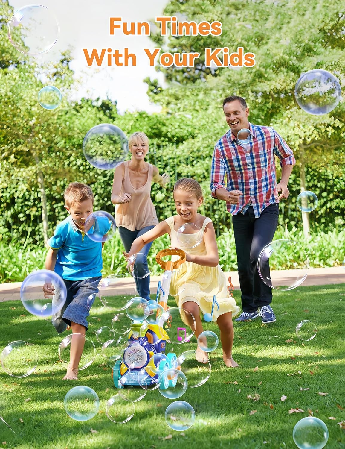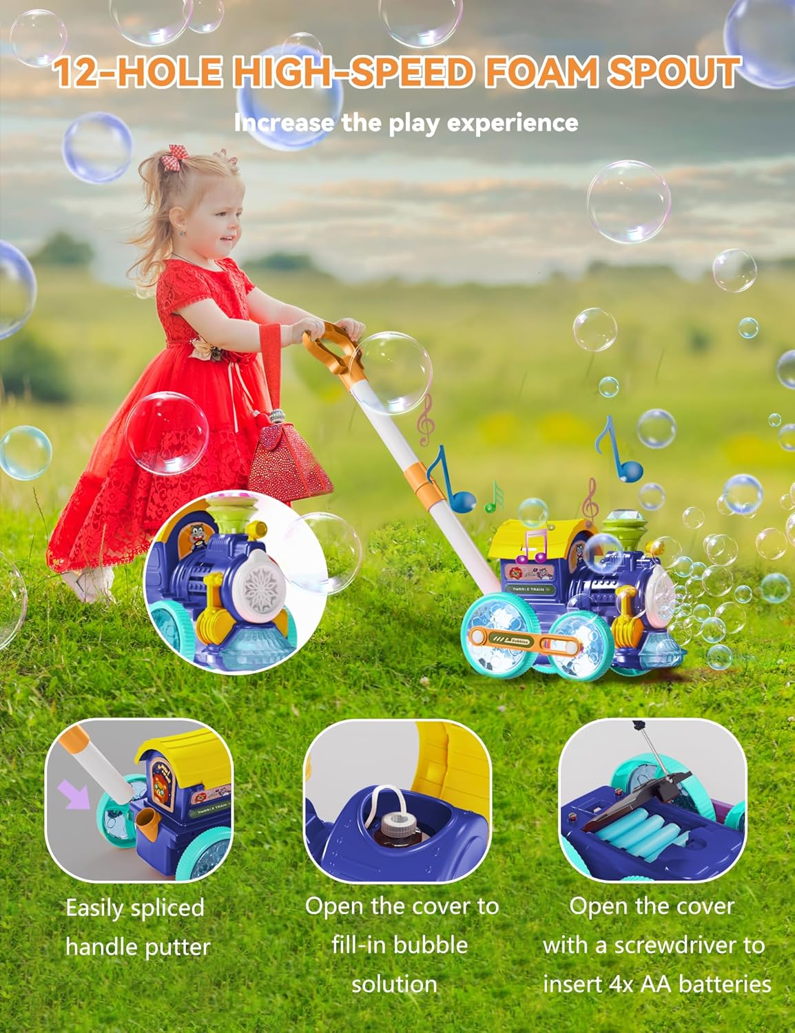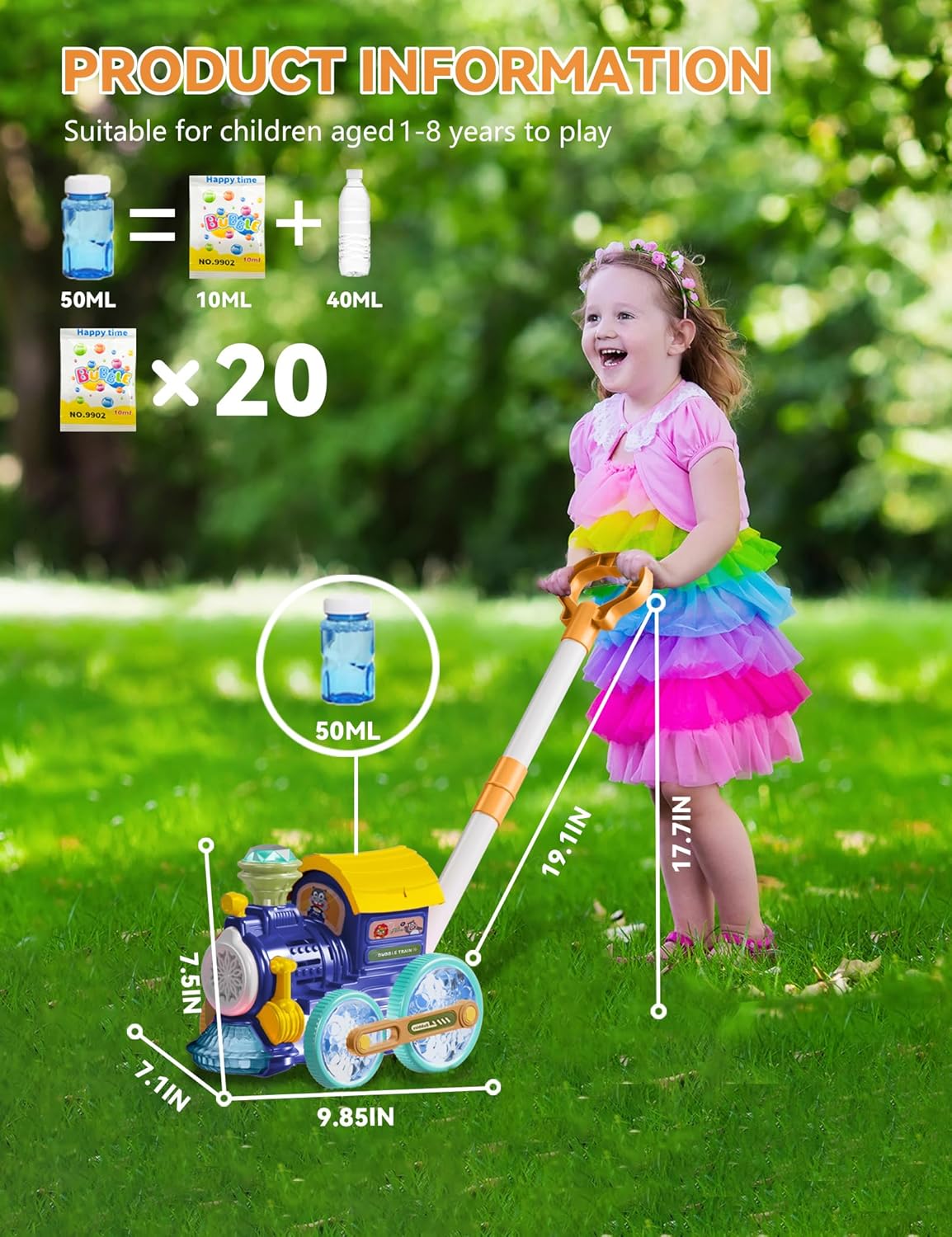 【Quality Material】Made of high quality ABS material, the bubble machine features a sturdy push-pull handle and wheels to ensure a safe and fun playtime for kids. The push-pull handle is removable and easy to carry on outings.Our bubble lawn mower for toddlers is non-toxic, non-BPA. Meet US toy standards. Safety test approved.