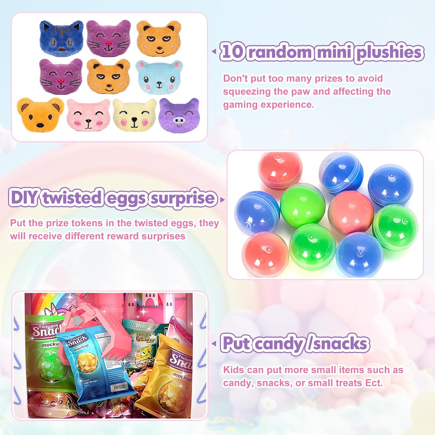 Claw Machine for Kids: Comes with 10 random plush toys, 10 mini surprise eggs, and 1 charging cord for instant fun. The Mini Claw Machine is a family-friendly arcade game that promotes parent-child communication and enhances children’s visual-spatial skills, hand-eye coordination and attention.