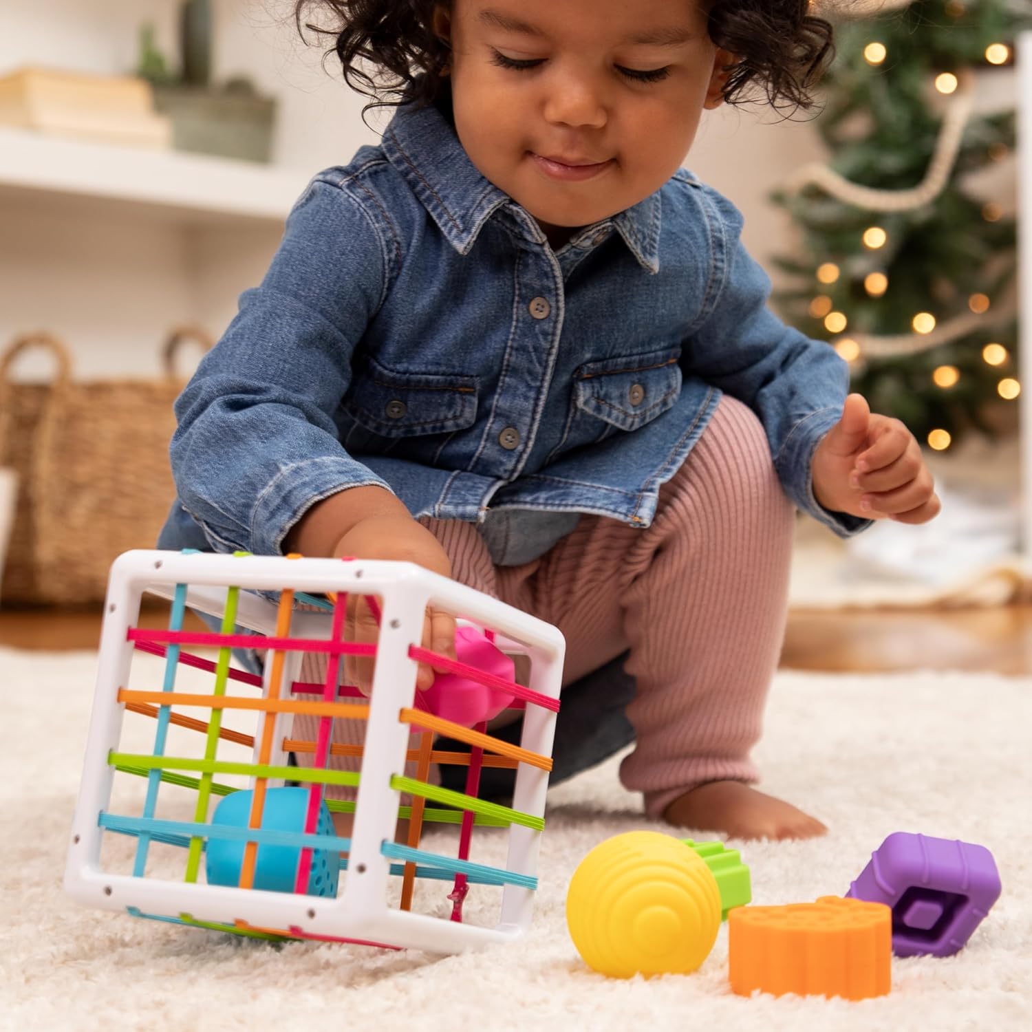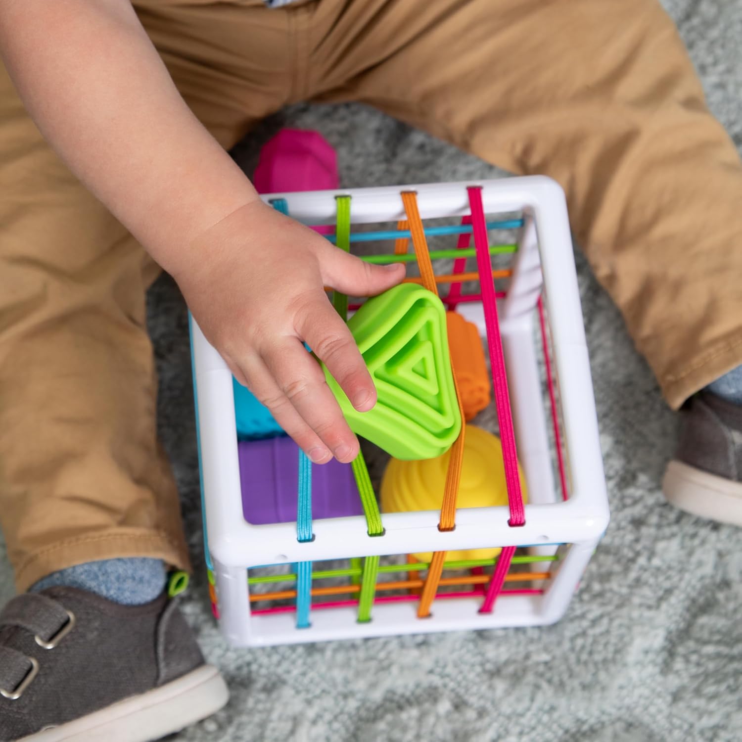 Explore the fun textures of the 6 chunky blocks; Push them through the elastic bands of the cube