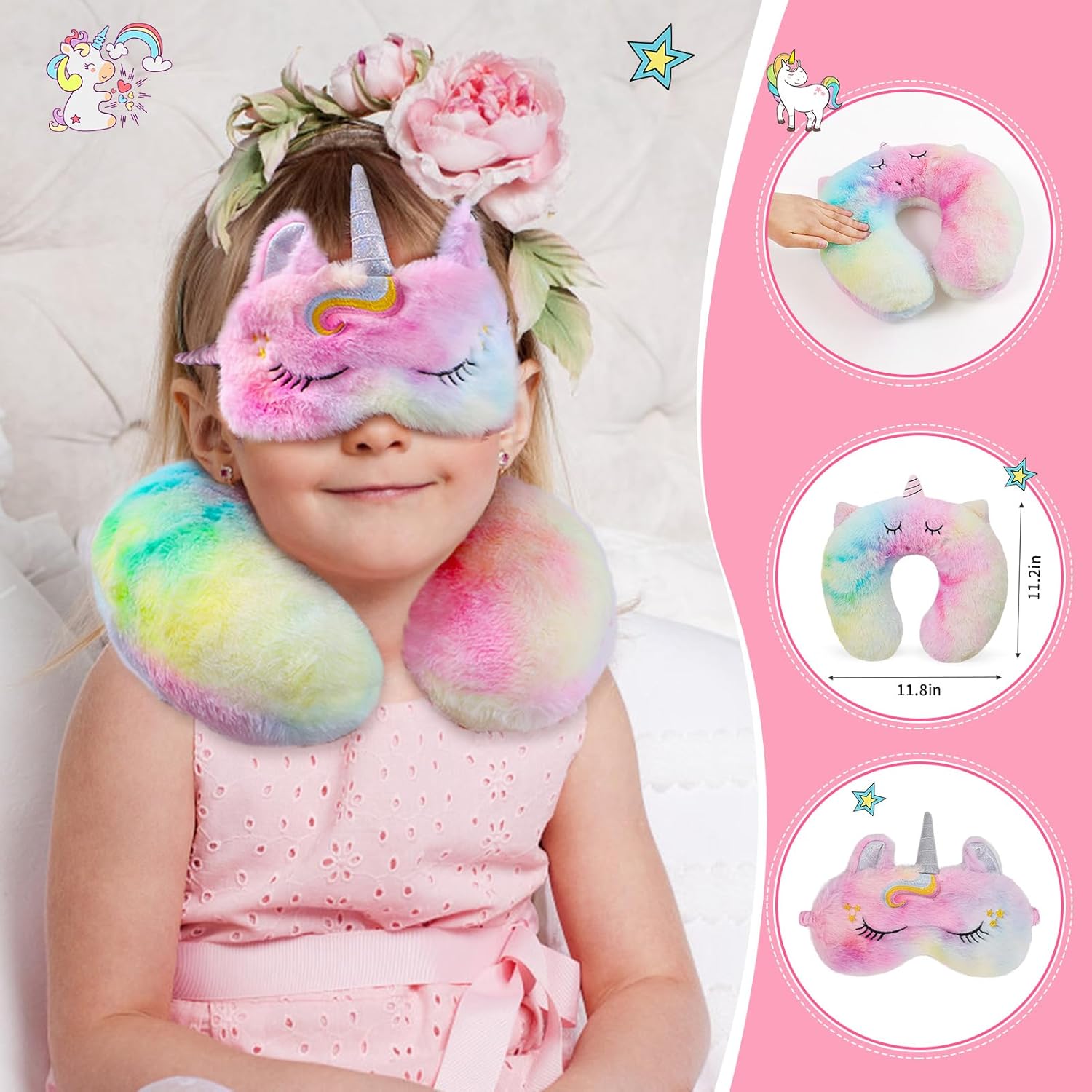 【Cute Unicorn Travel Neck Pillow&Eye Mask】—Our U-Shaped travel neck pillow made of high quality memory foam. All the products have been tested and are safe for kids use. When kids on airplane/car traveling, road trip or recline sleeping, they will keep away from pain on their neck and shoulder with our neck pillow and eye mask. With super soft plush socks, Your child will feel more comfortable while traveling. Your angel will enjoy a wonderful dreamland during the journey