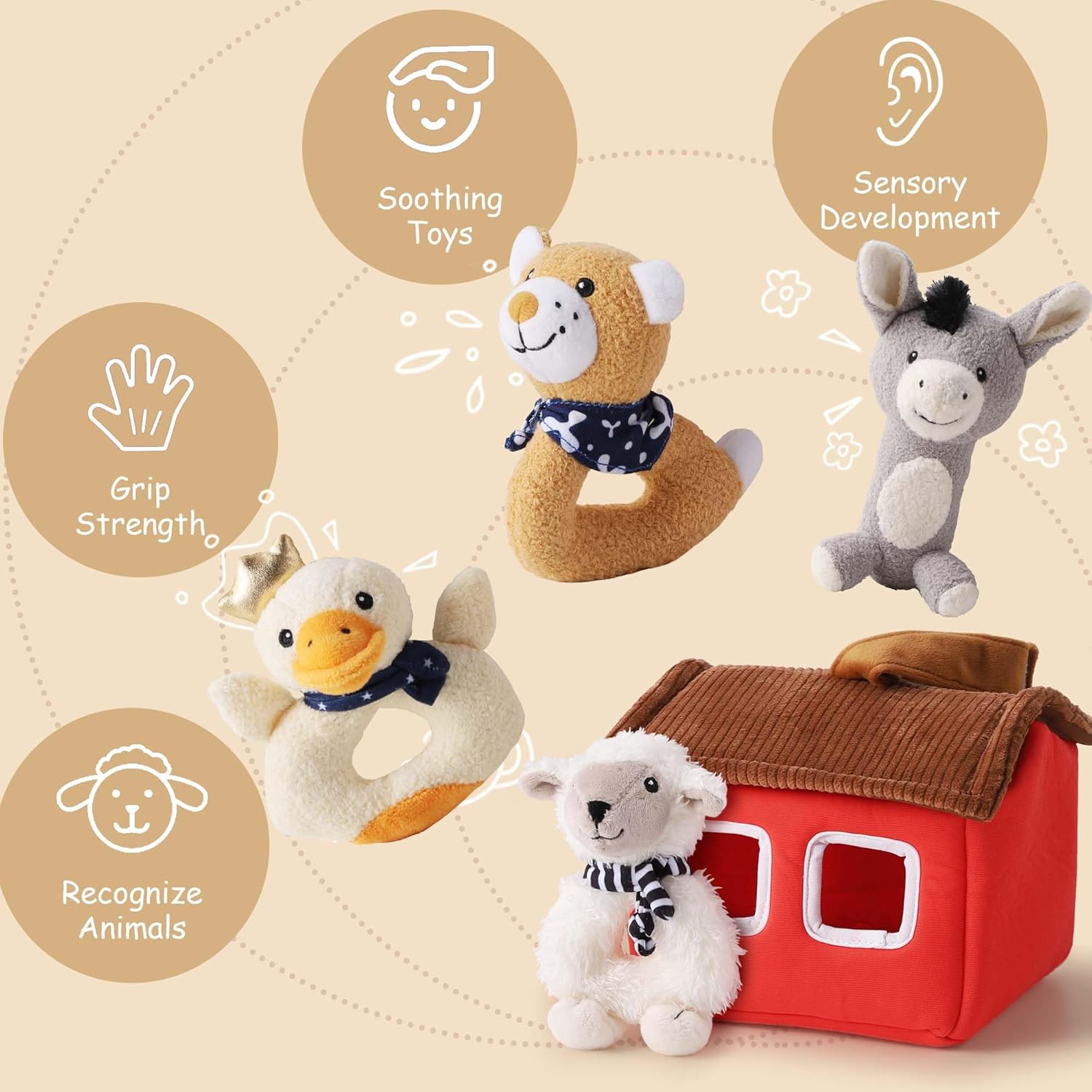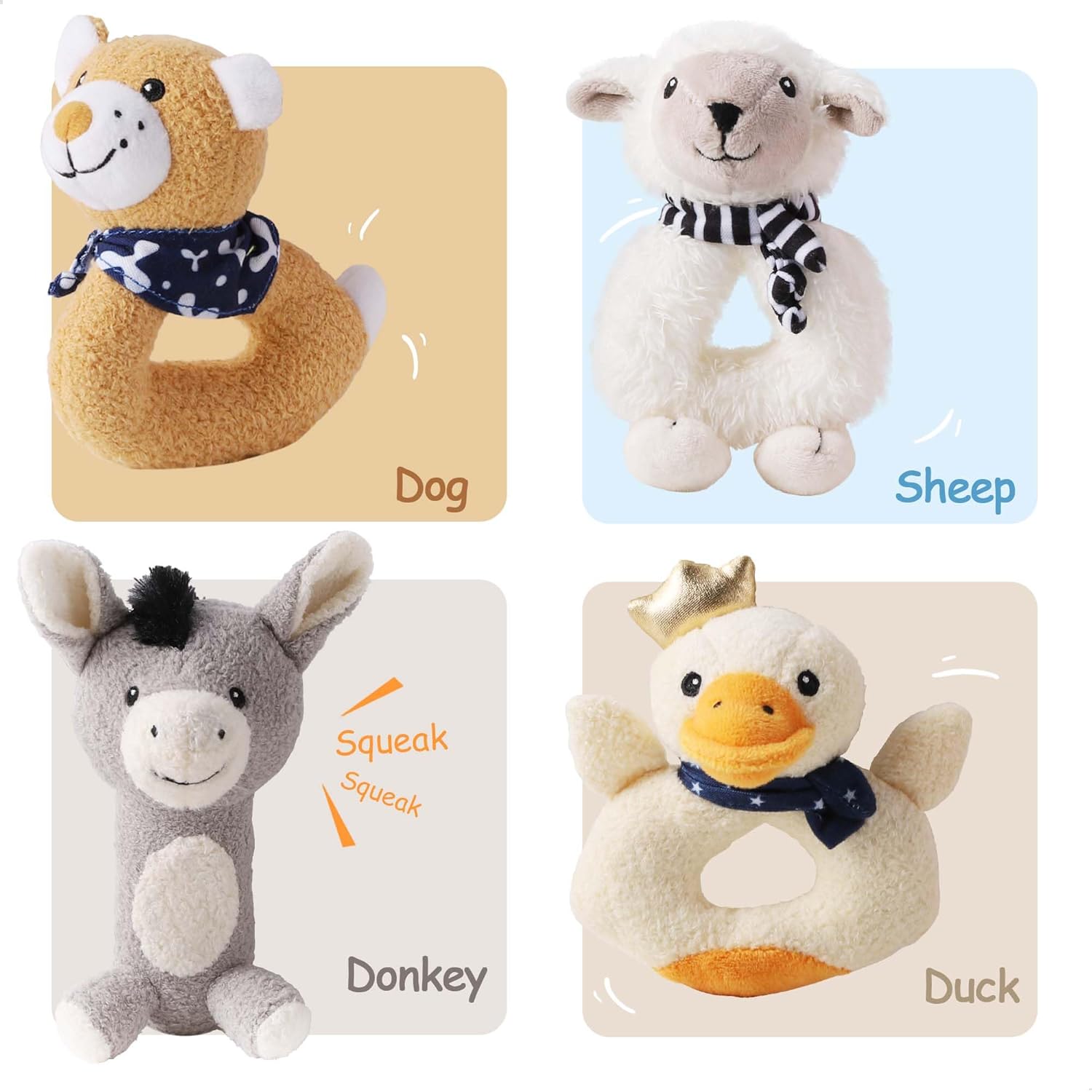 iPlay, iLearn Plush Baby Rattle Toys, Newborn Soft Barn Farm Stuffed Animal Set, Infant Hand Sensory Development, Girls Boys Stuff, Easter Birthday Shower Gift Basket Stuffer 3 6 9 12 Month 1 Year Old
