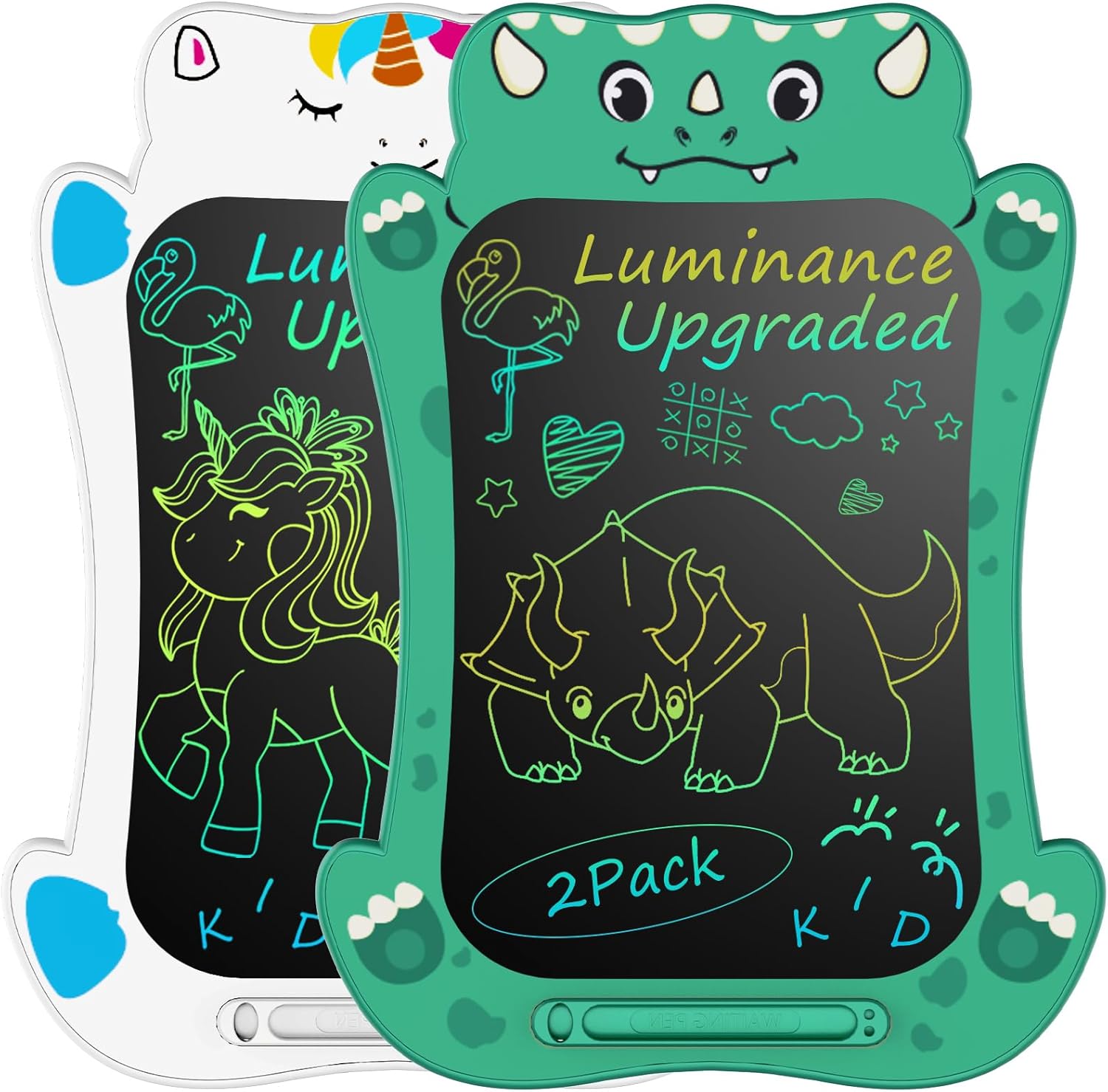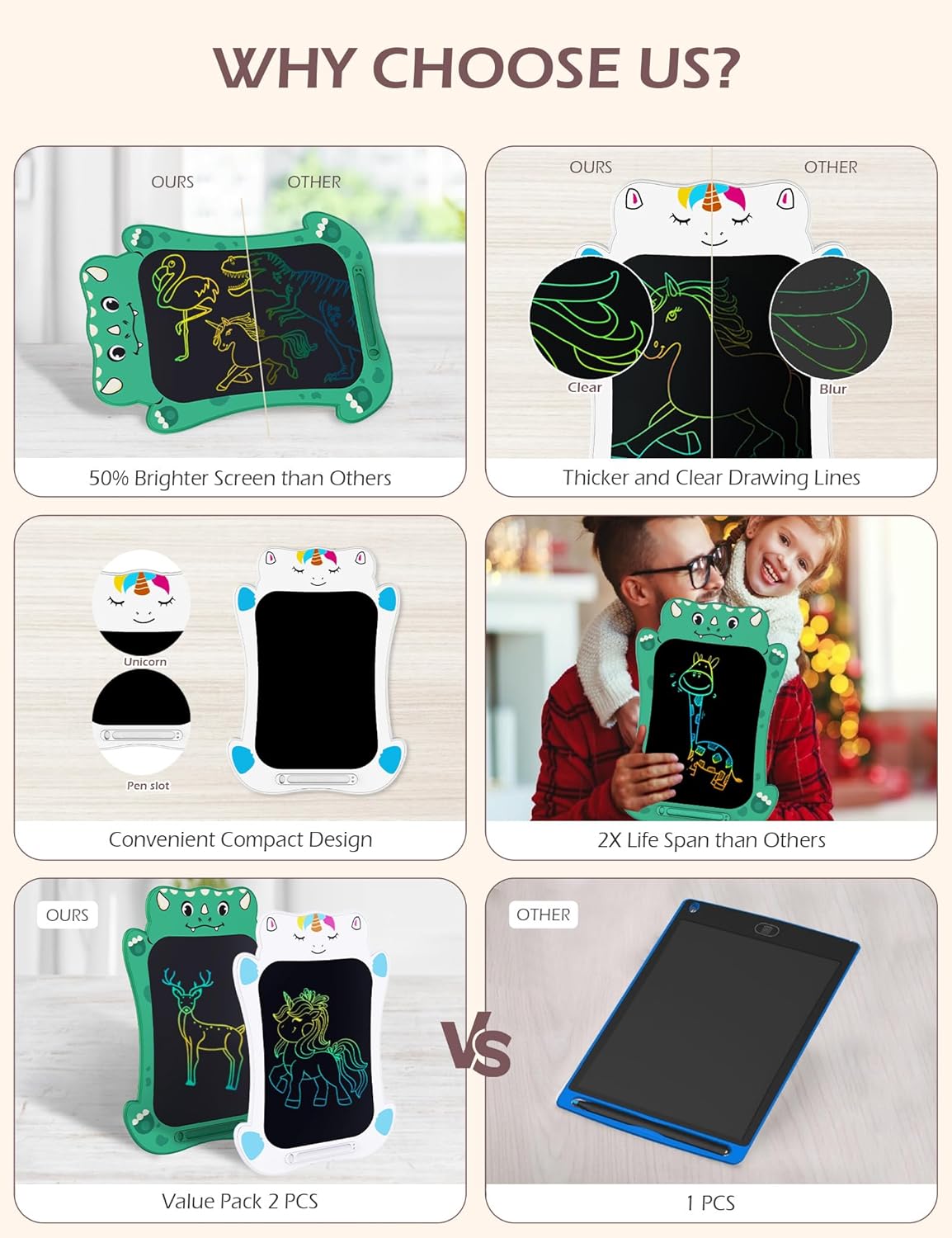 Eyesight protection. Get kids away from electronics screen time No chalk dust, no paint, no ink, no mess, easy use One click erase, reusable and long lasting Value Pack 2 PCS. Dinosaur and Unciorn for dinosaur unicorn lovers Light weight and durable. You may take it anywhere Develop kids’ imagination, creativity and mind. More than a doodle pad. You can doodle practice letters words numbers match, leave messages, take a note and more