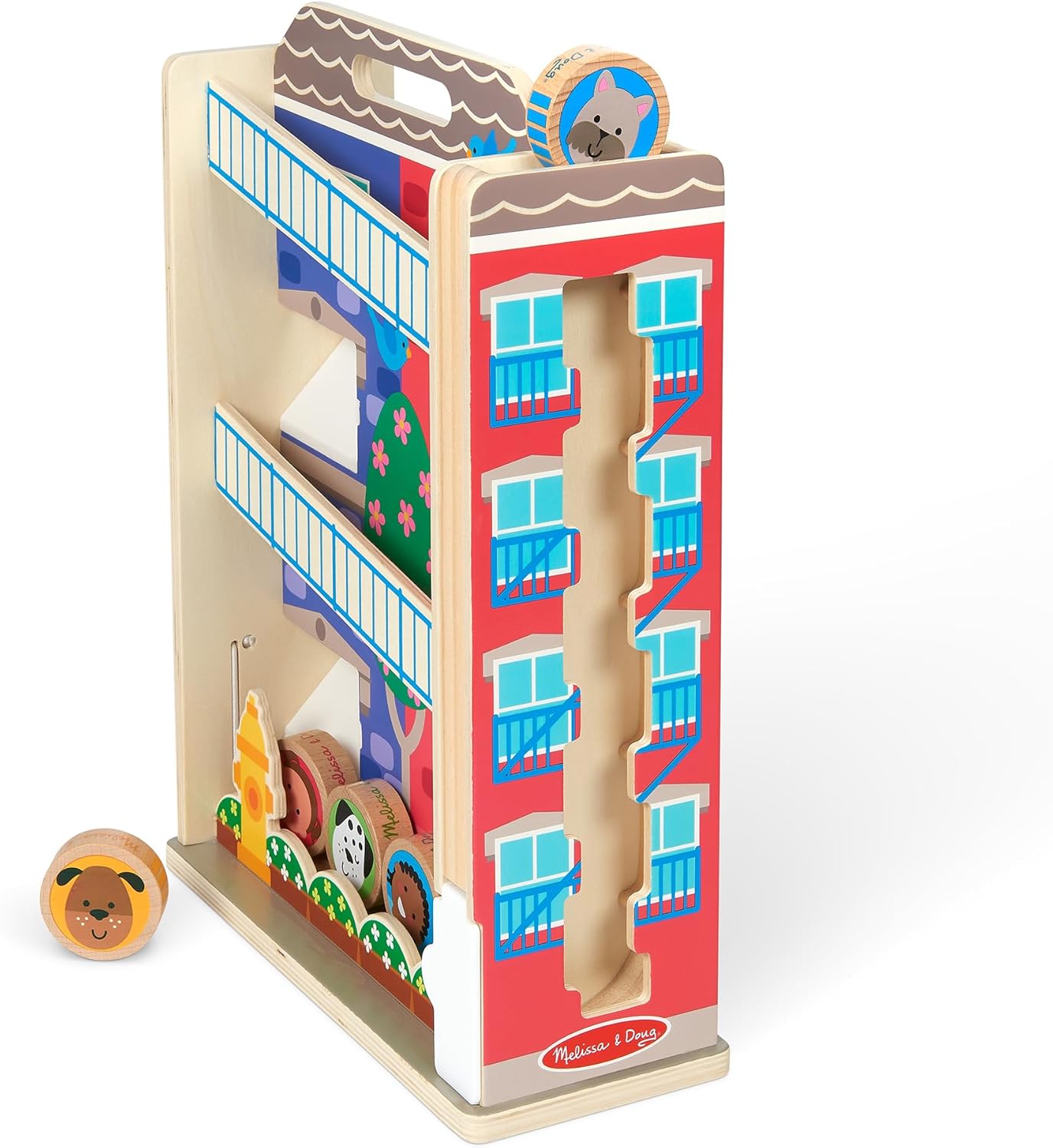 Let’s go play with friends that are fun to roll, stack, and grasp! Six double-sided chunky wooden GO Tots disks (12 collectible characters—6 people and 6 pets) tumble and twirl down ramps on the sturdy wooden town house with built-in carrying handle, transitioning from front to back of the building, and coming to rest in their beds. Drop in the top and they zigzag down the side fire escape and pop out the hatch at the bottom! Includes a peek-a-boo door and built-in mirror. Compatible with other GO Tots play sets. With Melissa & Doug GO Tots, toddlers 12 months and older will discover a new kind of kinetic play that offers opportunities to explore cause-and-effect through delightful motion-driven moments. Relatable, diverse characters and appealing shapes and textures encourage connections and exploratory, skill-building play. This product is certified by the Forest Stewardship Council. FSC certification ensures that products come from responsibly managed forests that provide environmental, social, and economic benefits, and that forests are protected for future generations. Please note that FSC certification applies to new inventory only (FSC C156584)