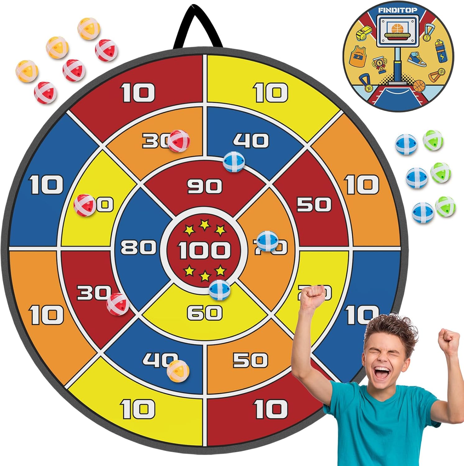 DOUBLE FUN 2 Games:Each side of Finditop is allowing you to play two different games. Challenge your kids with this easy to play dart game set. Who can get the highest score with 3 throws?
