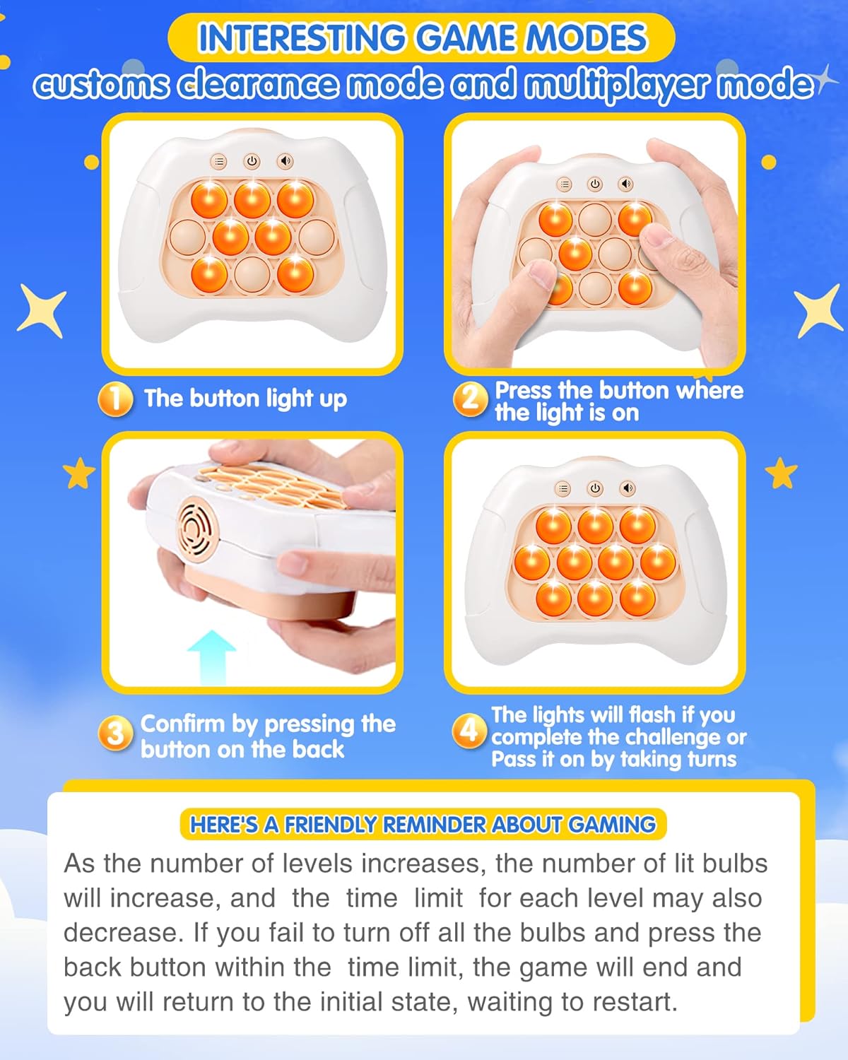 INTERACTIVE FIDGET TOY: This interactive fidget toy is perfect for releasing kids stress and enhancing sensory stimulation. The design makes it a great STEM toy for improving focus and engagement. Playing the fun games helps speed up pressing the flashing buttons and release stress