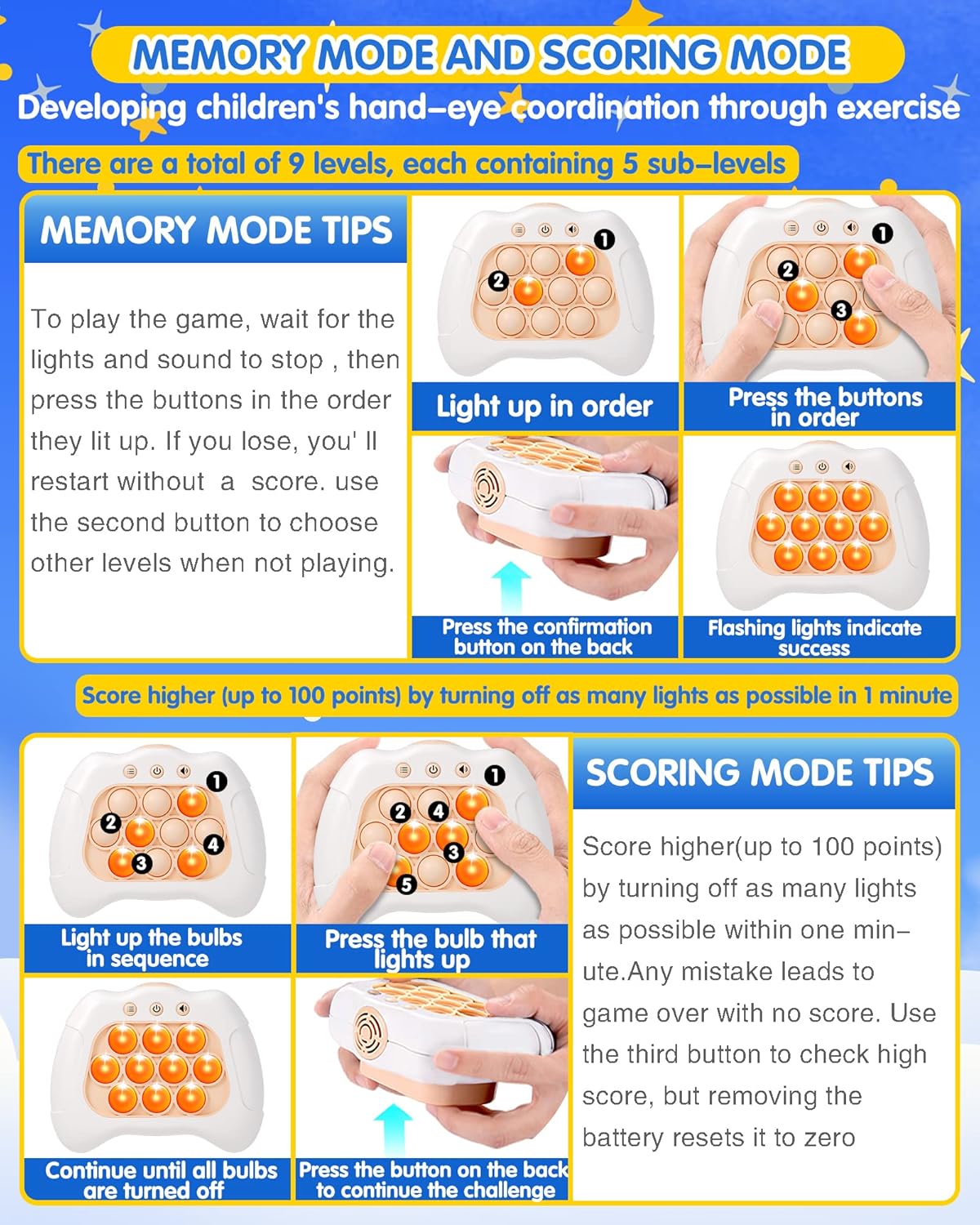 SHARPEN HAND & EYE COORDINATION: Playing the games on the game machine requires alertness as you race your fingers to press light-up buttons. It helps improve hand-eye coordination, reaction ability, memory, and logical thinking skills in a fun way