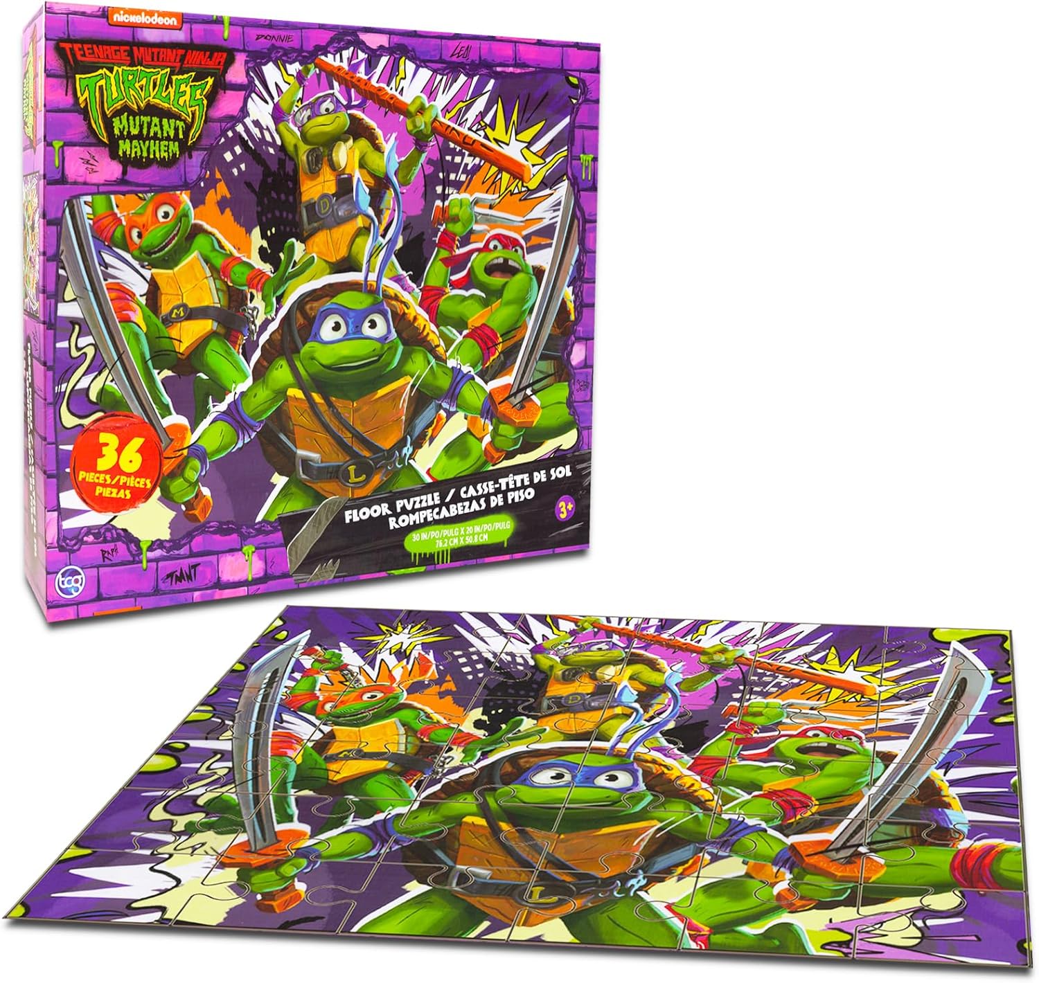 This Teenage Mutant Ninja Turtles puzzle set contains 1 floor puzzle with 36 pieces and measures 20×30″ when complete and depicts colorful artwork of Raphael, Leonardo, Donatello, and Michelangelo.
