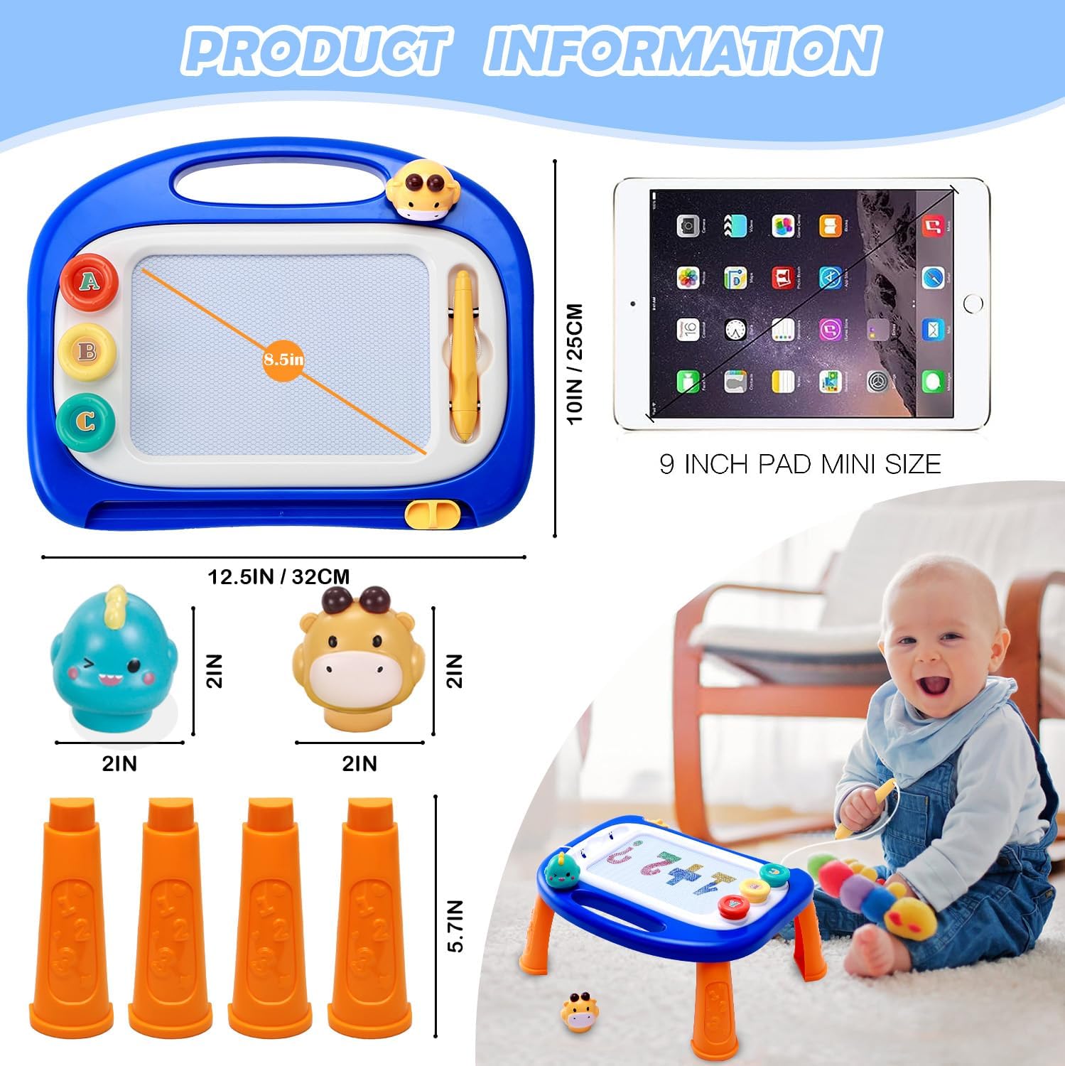 Educational Toys for 1 2 year old boys and girls:Foster artistic skills and fine motor development in your child with this magnetic drawing board. Kids can write draw and play on our toddler toys with the pen and 2 stamps, which will improved their utensil-holding skills. This Drawing Erasable Sketch Board combines the regular doodle board with removable pegs, which allows using this board either flat on surface or like a table, so kids can stand or sit to draw- great toy for toddlers