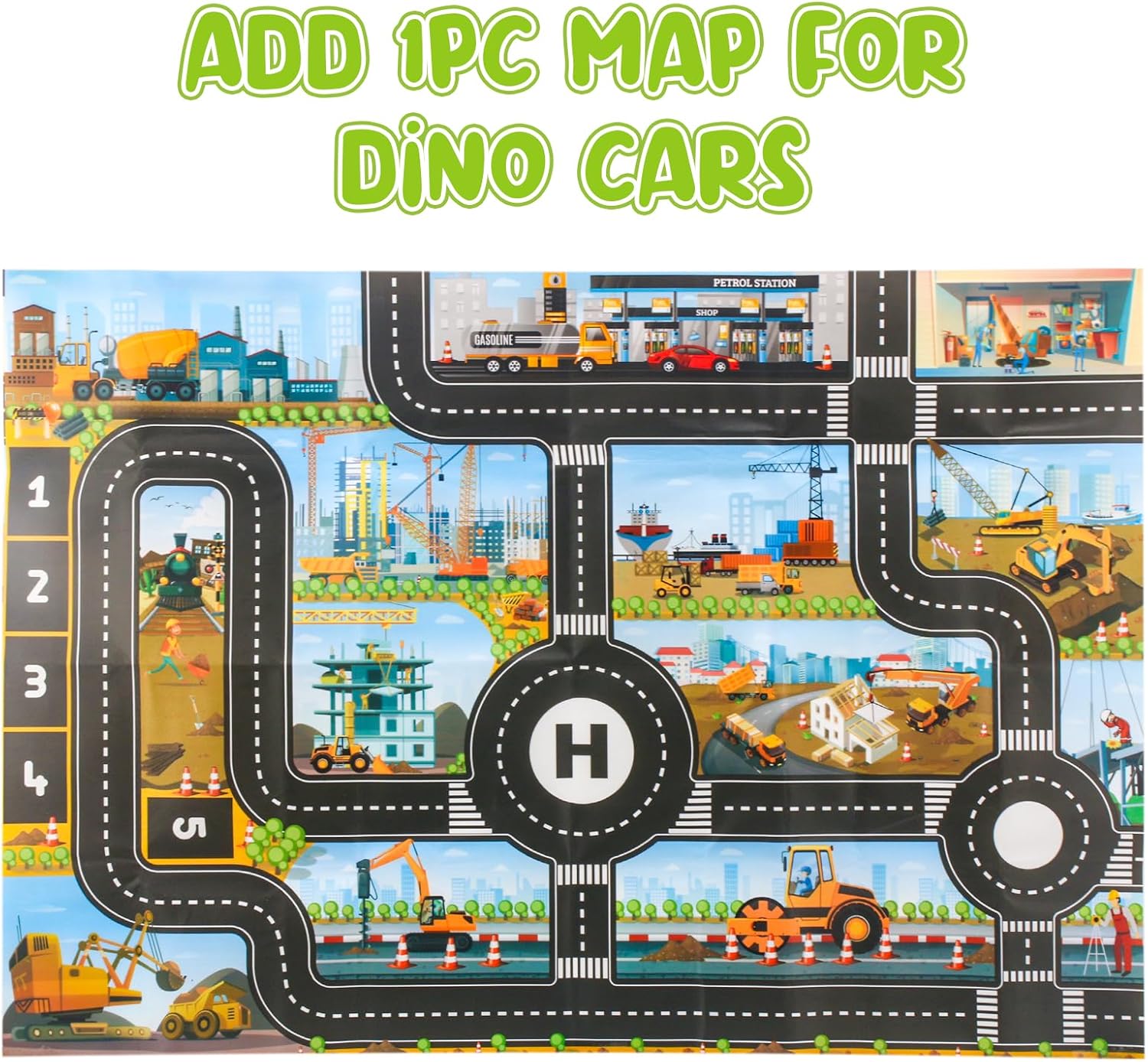 【 Large large dinosaur, toy dinosaur cars + 1 map 】4-in-1 dino truck set featuring a map and Triceratops Steamroller, Pterodactyl Bulldozer, Brachiosaurus Drill Rig, and Tyrannosaurus Excavator. Perfect for igniting imaginative play and learning through interactive fun