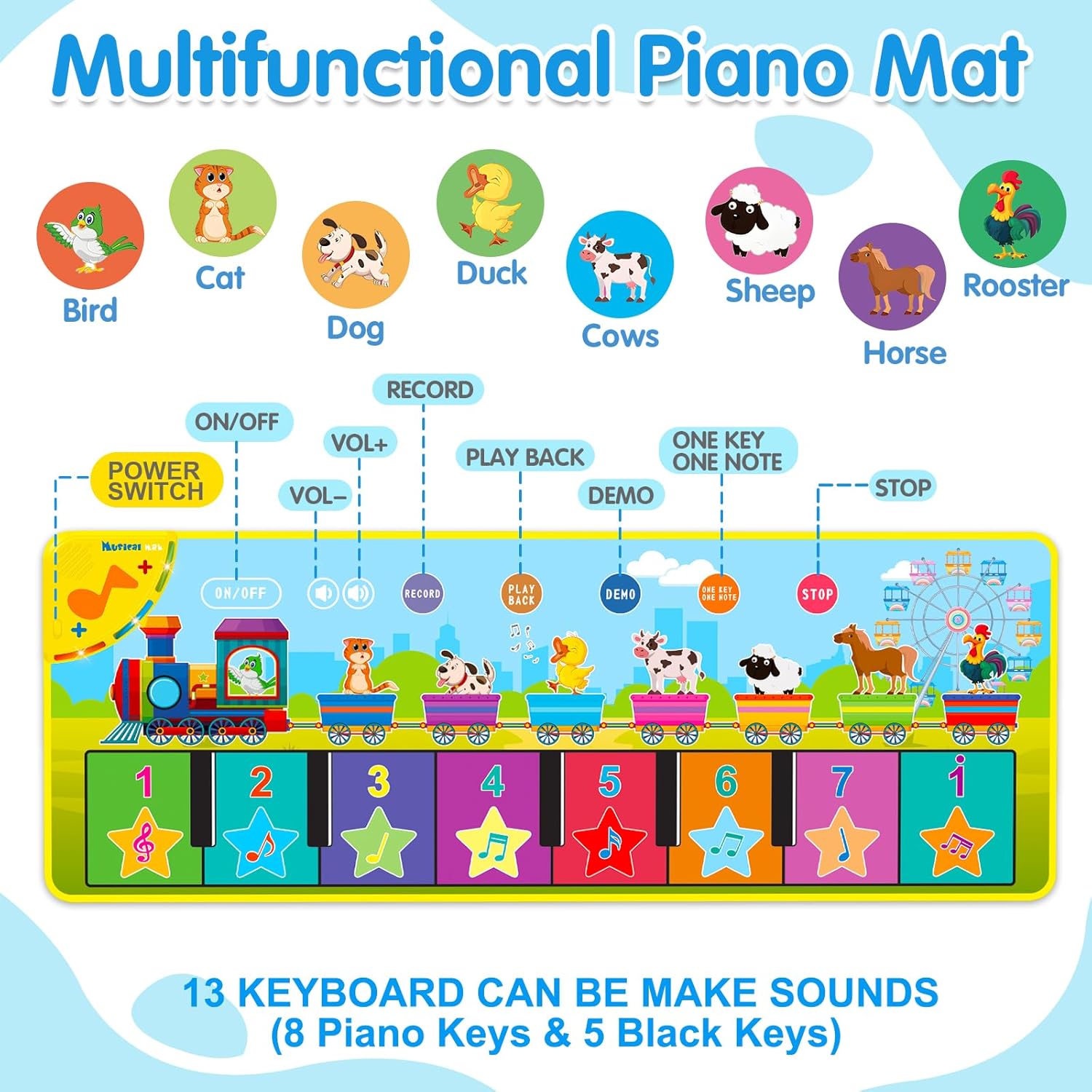 【Multifunctional Piano Mat】This musical toys for toddlers 1-3 has 8 function keys, 15 level adjustable volume, contains 34 built-in sounds(8 animal sounds, 13 piano keyboard sounds, 13 children songs), press the animal pattern and you will hear realistic animal sound. Kids can touch animal music mat with hand or foot to make a sound, or dance with friends, which can exercise children’s ability of coordination. Best toys for 1 year old boys, 1 year old girl gifts, baby piano mat kick and play.