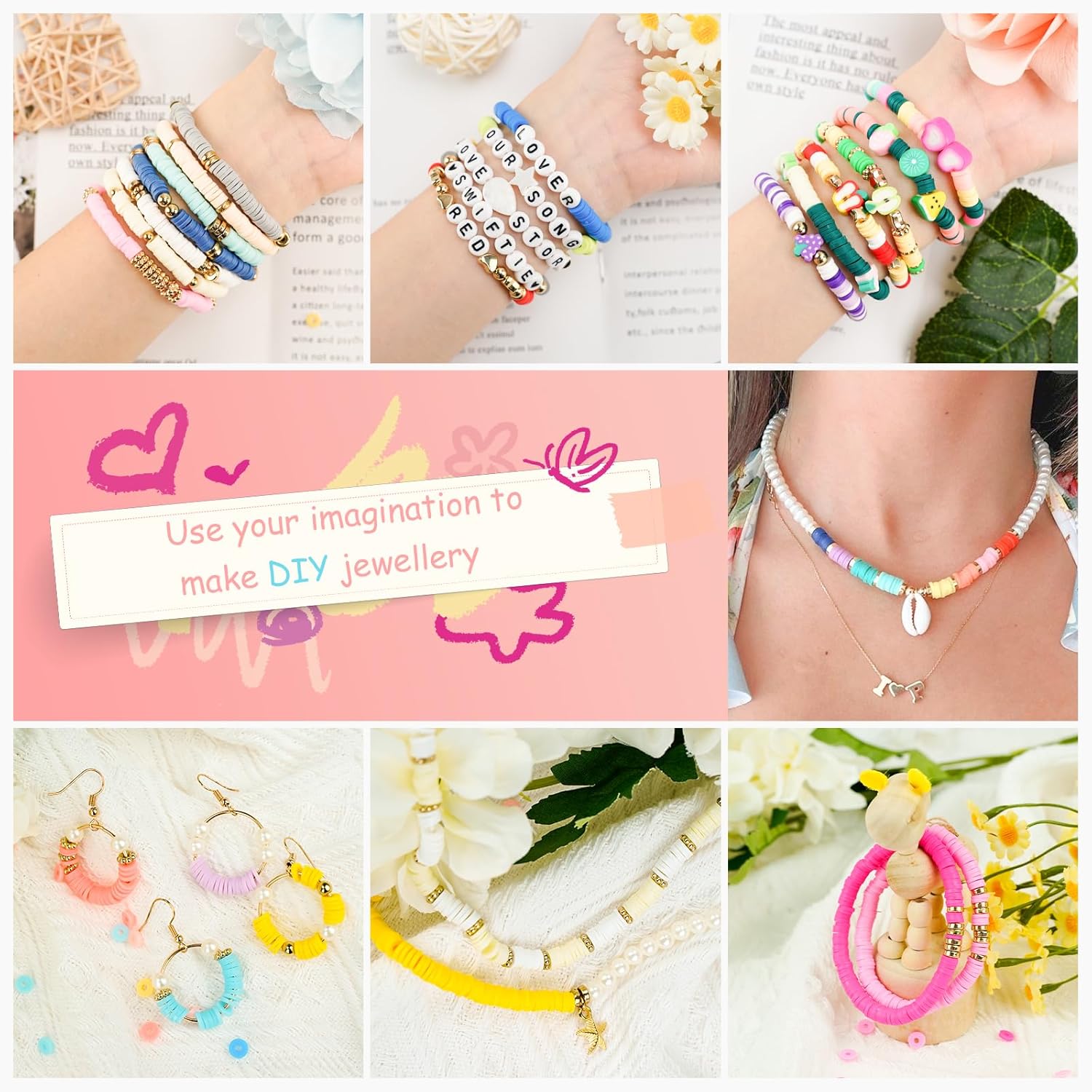 Designed for Friendship Bracelets: This kit includes 28 classic colors of clay beads, letter beads, heart beads, smile beads, fruit beads, devil’s eye beads, pearls, shells, vintage charms, spacer beads, lobster clasps, ear hoops, and more, providing a wide variety of options for your friendship bracelet making, concert Merch, birthday decorations, party favors, etc.
