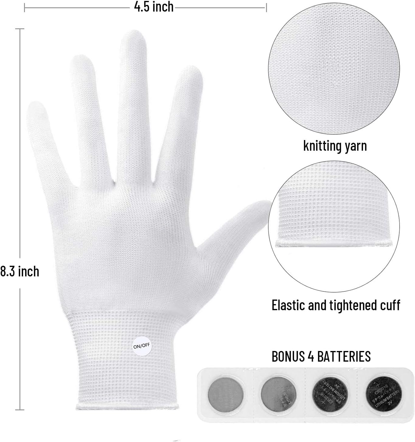 PACKAGE INCLUDED : It is equipped with 2 pieces CR2016 batteries in each glove, Easy to replace the battery. Open the velcro hidden in the wrist of the gloves, take out the white battery pack then you can replace the battery easily. If you receive defective product or meet any problems, please feel free to contact us.