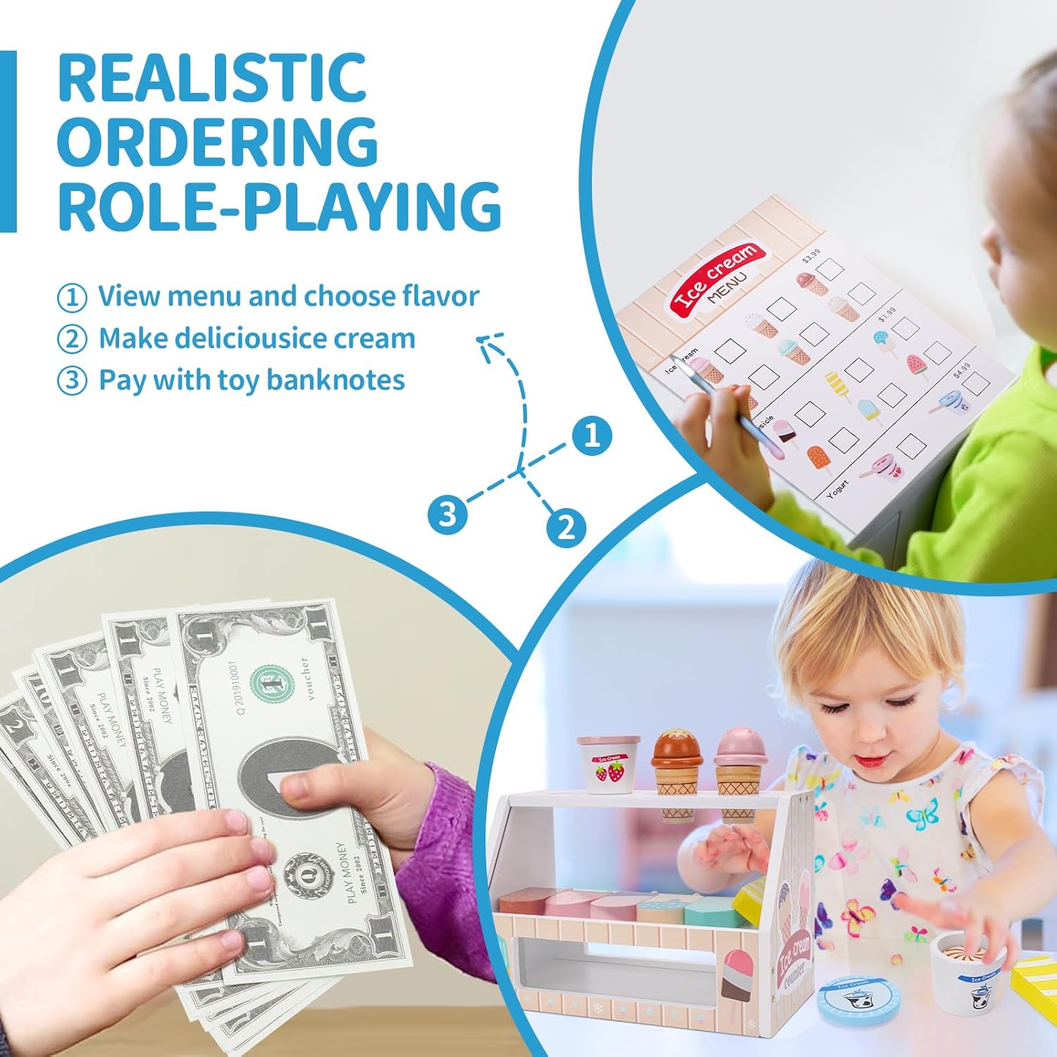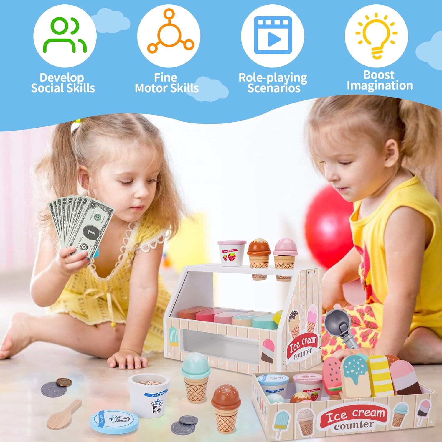 Wooden Ice Cream Counter Playset for Kids, Toddler Girl Toys Kitchen Playset Pretend Play Gifts for 3 4 5 6 Year Old Girl or Boy, Play Food Scoop and Serve, Play Kitchen Sets for Kids Ages 4-8